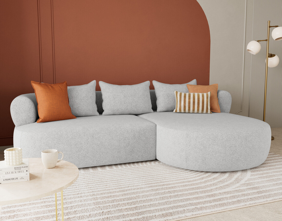 Le canapé d’angle droit Angela impose son style avec une silhouette élégante soulignée par des dossiers arrondis et une méridienne ultra tendance. Son design fluide et accueillant transforme votre salon en un espace cosy et chaleureux. Pensé pour le confort, il offre une belle largeur et une profondeur d’assise idéale pour s’installer longuement, que ce soit pour lire, discuter ou simplement se détendre.