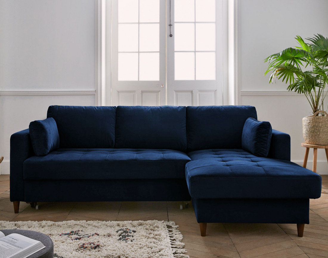 • Canapé d'angle droit 4 places convertible avec coffre en velours Anna