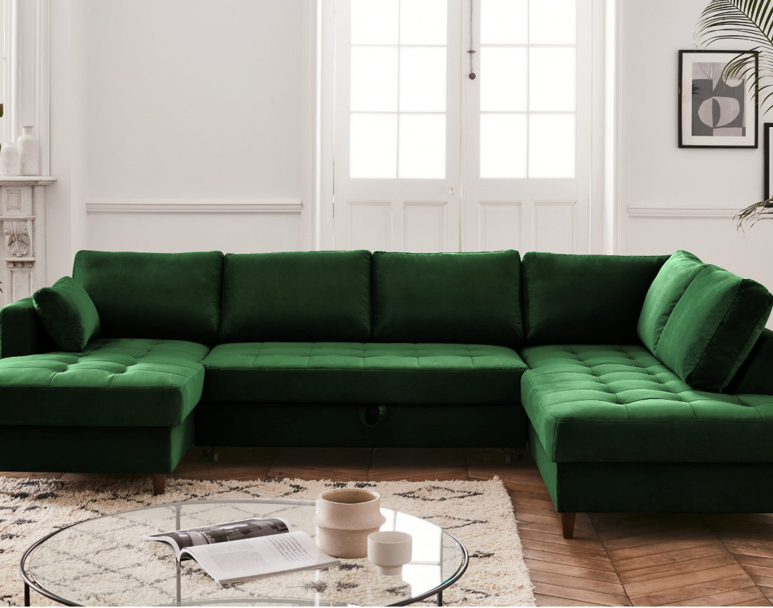 Ce joli canapé panoramique Anna plaira à toute la famille grâce à son style contemporain. Le revêtement en velours rend le canapé agréable au toucher. Son assise capitonnée donne un charme et un style unique qui conviendra parfaitement avec tout style de décoration d’intérieur. De plus, vous avez le choix dans les différents coloris proposés.