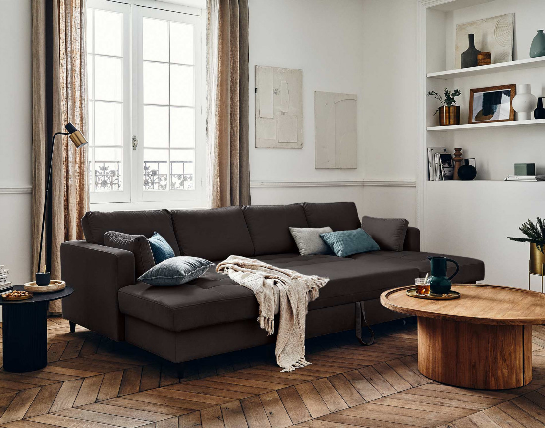 • Canapé panoramique en U 7 places convertible avec coffre en velours Anna