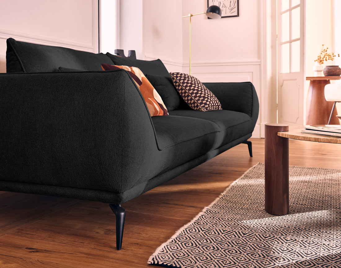 Le canapé Arica est revêtu d'un tissu texturé de haute qualité. Il apportera une dimension à la fois cosy et sophistiquée à votre intérieur, notamment grâce à sa superbe finition à passepoils. Ses pieds hauts en métal noir lui confèrent par ailleurs une allure moderne, mais ils faciliteront aussi le nettoyage sous le canapé. En outre, ce modèle est fabriqué en Europe. En plus de ses finitions soignées, cette caractéristique lui assure une belle durabilité.