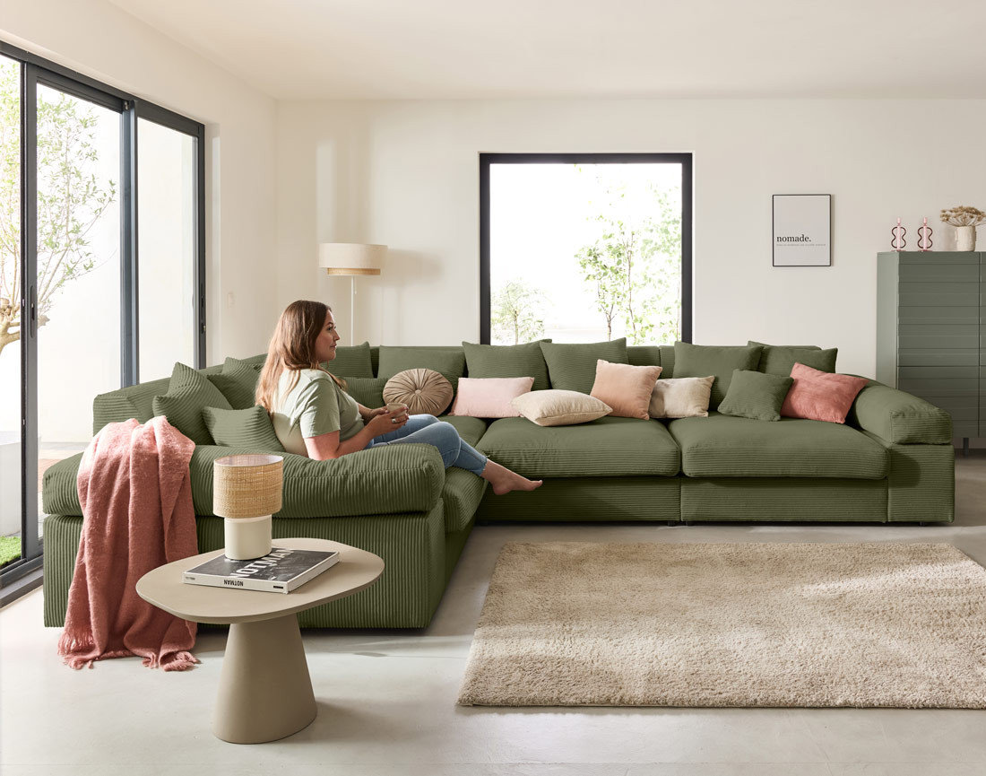 Un modèle à la pointe des dernières tendances, qui trouvera aisément sa place dans un salon aux allures contemporaines et raffinées. N’hésitez pas à associer son joli velours côtelé à des matières contrastantes, telles que le bois foncé, le lin ou le coton, le raphia, ou pourquoi pas, à un tapis berbère aux teintes vives. Vous pouvez également l’associer à une table basse gigogne arrondie aux dimensions généreuses, afin de créer un contraste des volumes du plus bel effet.