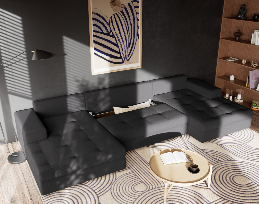 Pensé pour répondre à tous vos besoins, le canapé Bastian se transforme facilement en lit d’appoint spacieux, parfait pour accueillir vos invités. Son grand coffre de rangement intégré permet de garder plaids et coussins à portée de main, tout en gardant un salon toujours bien rangé. Confortable, fonctionnel et esthétique, ce canapé en U convertible, signé Best mobilier, combine à la perfection style contemporain et praticité du quotidien.