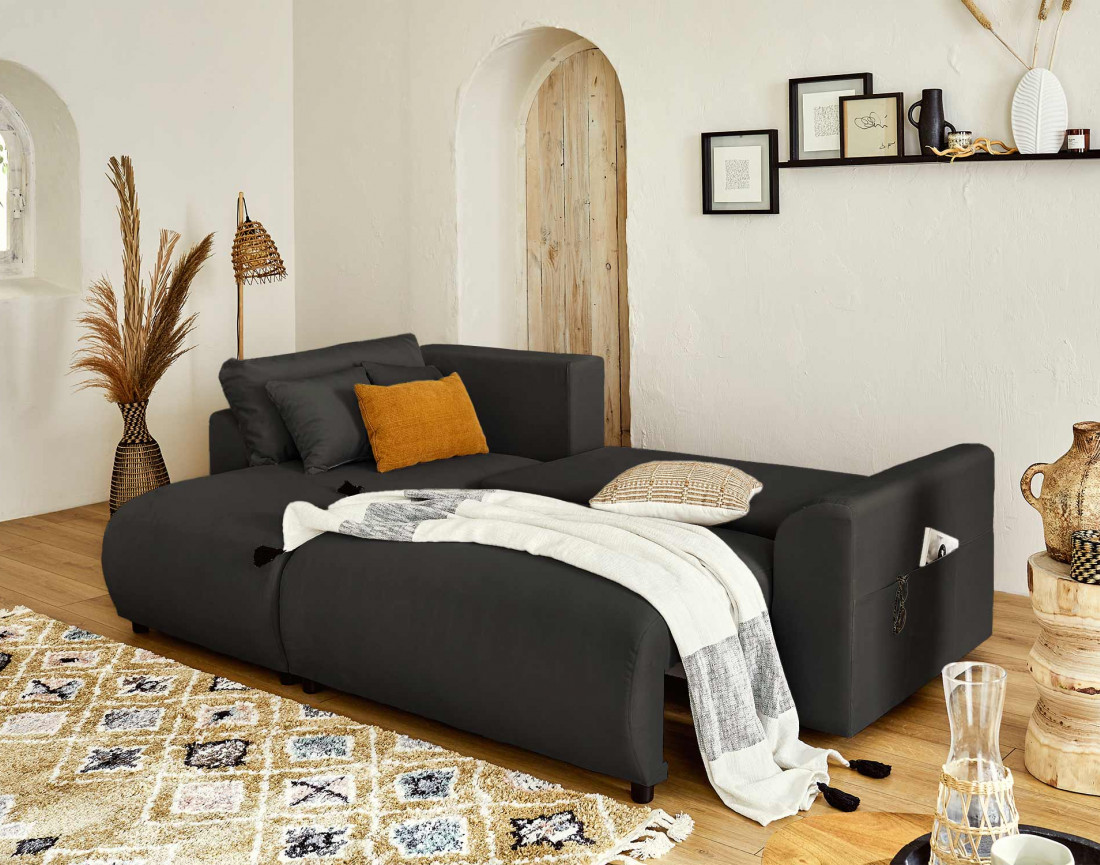 Appréciez le confort et les fonctionnalités de ce canapé qui deviendra la pièce maitresse de votre salon. Grâce à son angle réversible, vous pourrez changer en tout simplicité la position de l’angle en plaçant la méridienne à gauche ou à droite du canapé. En quelques secondes, vous pourrez profiter de sa fonction convertible qui offre un couchage occasionnel pour deux personnes. Enfin, le canapé Camelia propose également un coffre de rangement sous son assise ainsi que des poches de rangement sur chacun de ses accoudoirs pour un gain de place assuré !