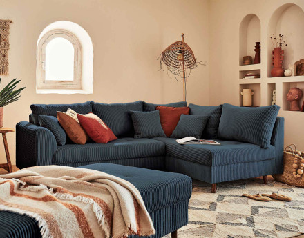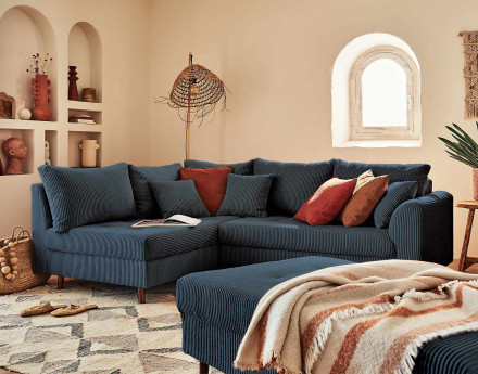 - Canapé bleu marine : il sera parfait pour créer une ambiance marine classique ou côtière bohème avec, par exemple, des murs peints en blanc et l’ajout de matières robustes et naturelles telles que le bois et le rotin.