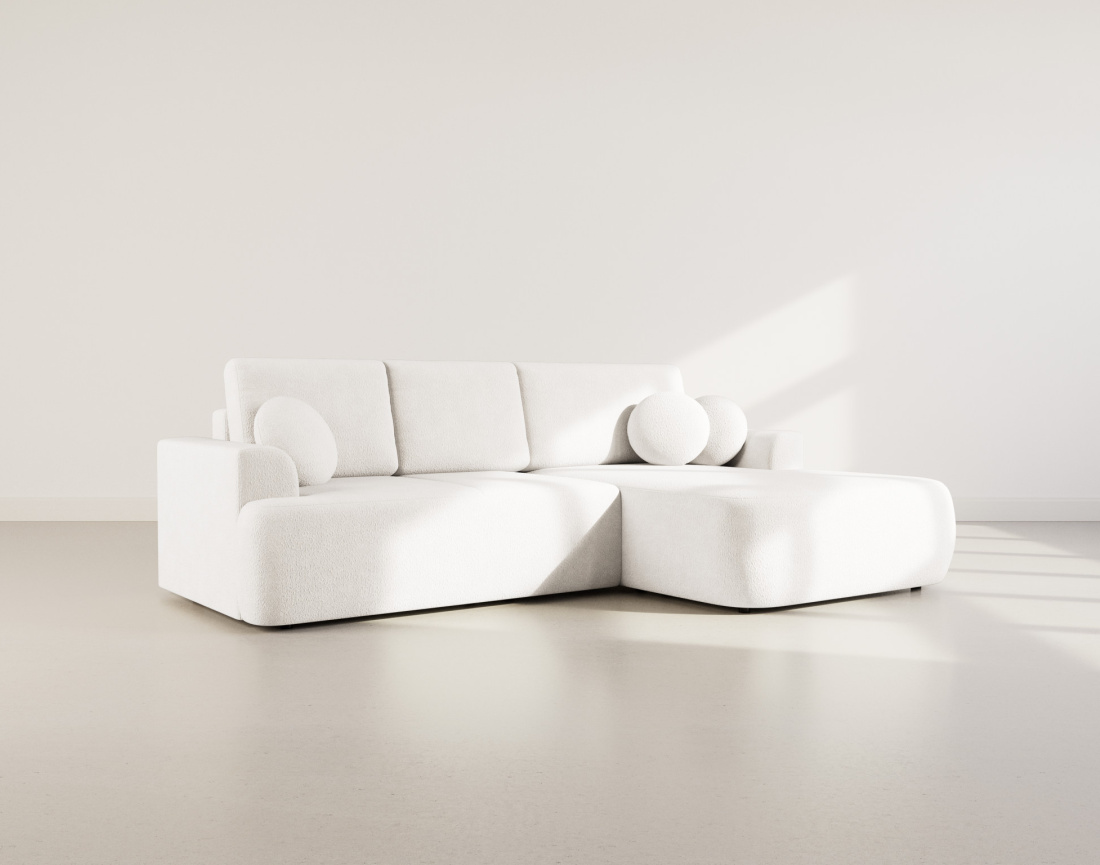Avec le canapé d’angle droit Candela, c’est toute la définition du confort que vous allez revoir. Conçu pour accueillir jusqu’à quatre personnes, ce meuble d’angle est parfait pour se détendre ou profiter de moments conviviaux. Sa structure robuste et ses coussins moelleux vous garantissent un soutien optimal. Son tissu bouclette doux est très agréable au toucher et illumine votre décoration intérieure. Chaque assise est soigneusement rembourrée pour vous offrir une expérience agréable et prolongée, même devant un film en version longue. Sa conception élégante et moderne s’intègre parfaitement dans tout type d’intérieur. Les coussins ronds décoratifs inclus ajoutent une touche de style et de confort supplémentaires.