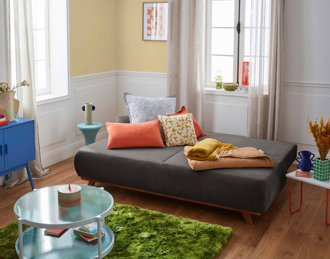 - Grâce à son dossier rabattable, ce canapé devient un lit d'appoint en un instant