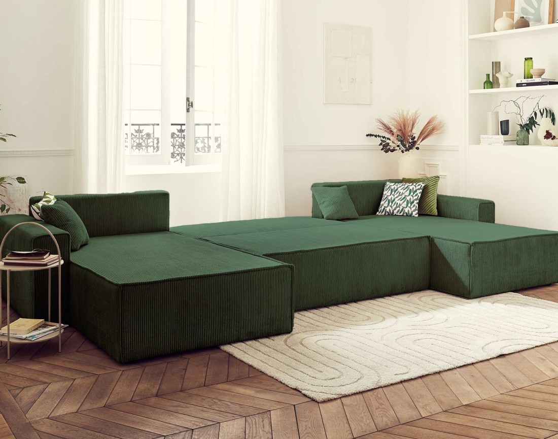 Associez notre Pouf Topaze à votre canapé Dellia. Celui-ci a été conçu dans la même matière, en velours côtelé épais, pour s'accorder parfaitement.