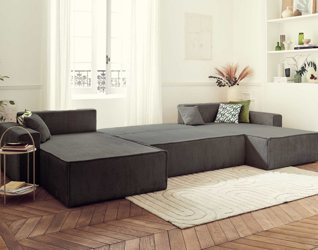 Dellia - canapé panoramique en U - 7 places - convertible - avec coffre - en velours côtelé