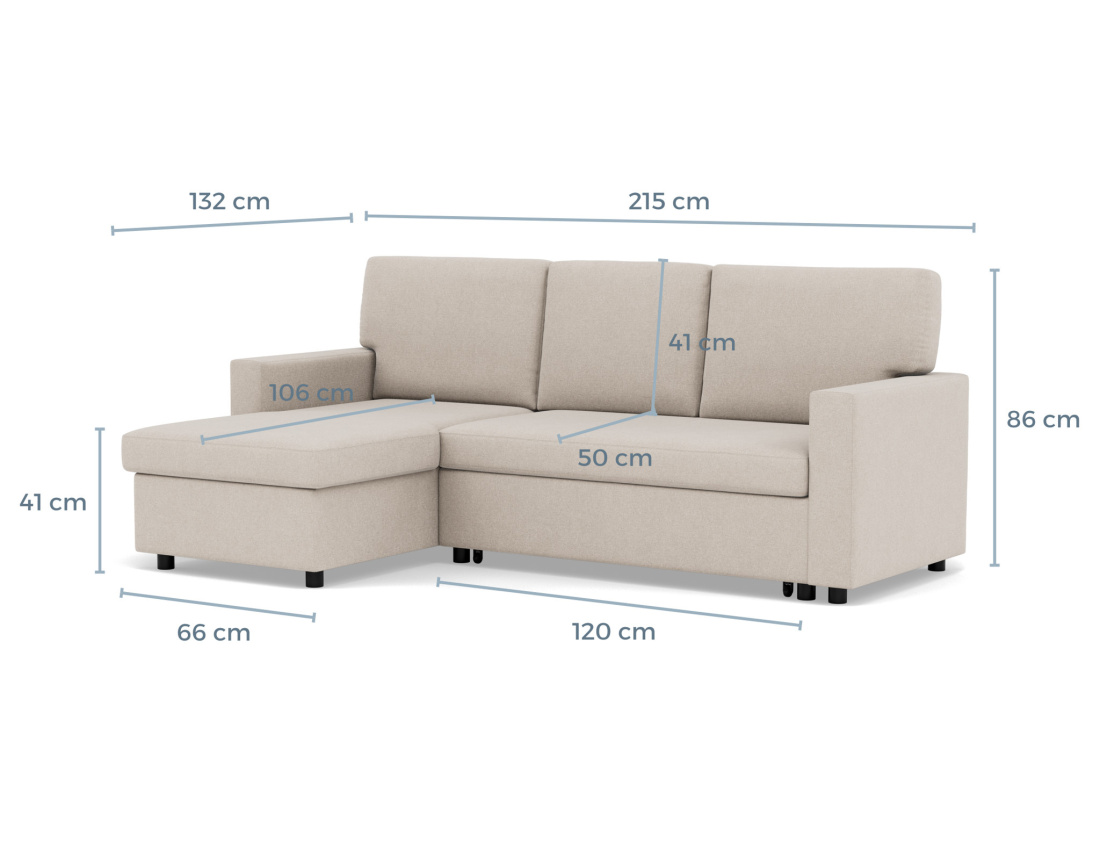 Le canapé d'angle Meiya se distingue par ses nombreux atouts. Son assise et son dossier, soigneusement rembourrés, garantissent une expérience de détente inégalée. Grâce à son angle réversible, vous pouvez facilement ajuster l’orientation du canapé en fonction de vos besoins, en le plaçant à gauche ou à droite. Le modèle Meiya est aussi convertible, offrant ainsi une solution pratique pour recevoir vos invités. En un instant, transformez-le en un couchage d'appoint de 186x148cm, grâce à son tiroir. De plus, son coffre de rangement intégré de 127x58cm est parfait pour organiser vos coussins, plaids et autres accessoires, maximisant ainsi l’espace de votre salon.