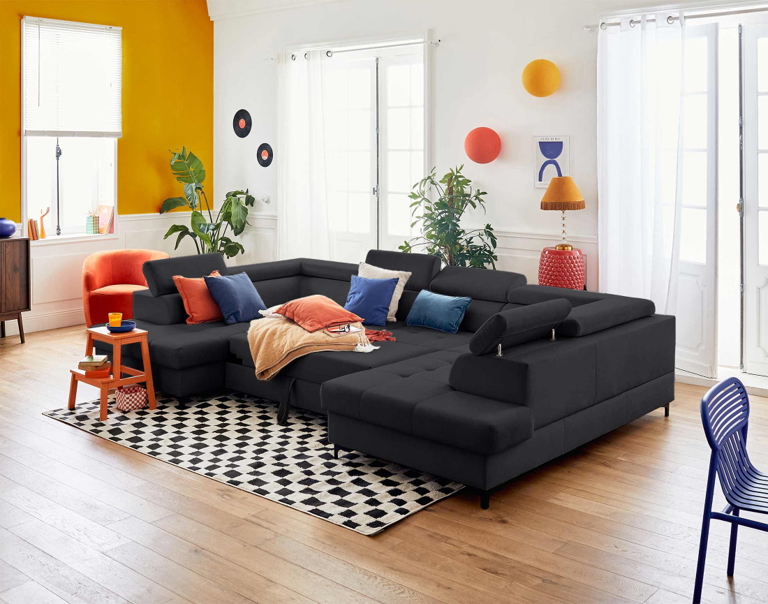 Merida - canapé panoramique en U - 7 places - convertible avec coffres et têtières réglables - en velours