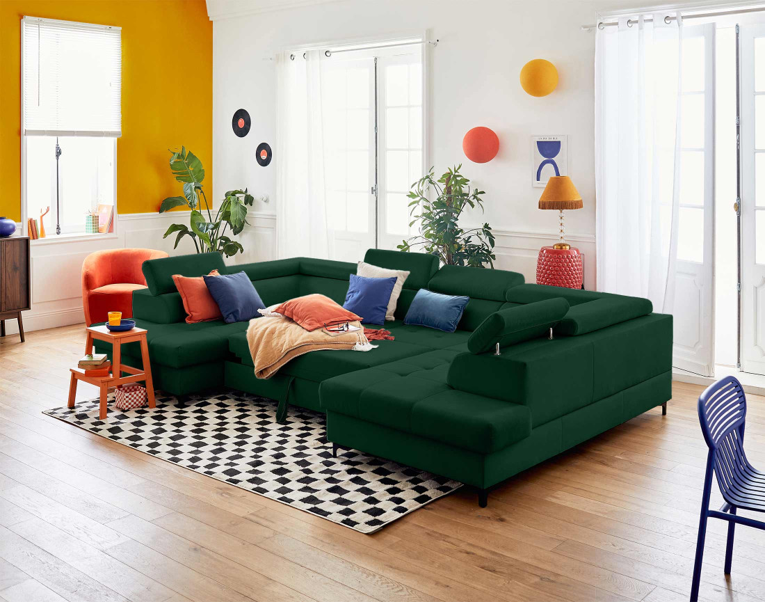 Merida - canapé panoramique en U - 7 places - convertible avec coffres et têtières réglables - en velours