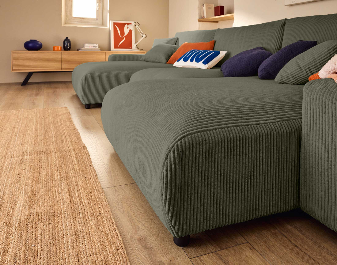 Pivoine - canapé panoramique en U - 7 places - convertible avec coffre - en velours côtelé