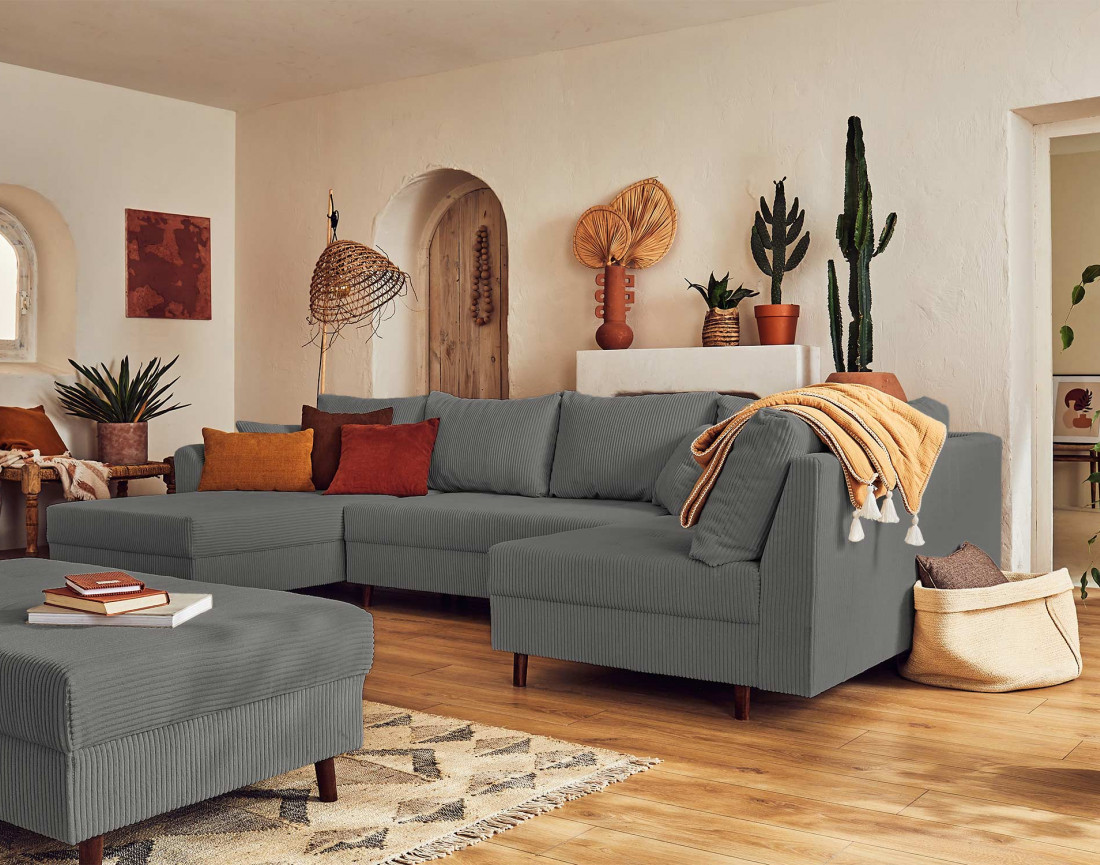 Rune - canapé panoramique d'angle droit - 7 places - avec pouf d'appoint - en velours côtelé