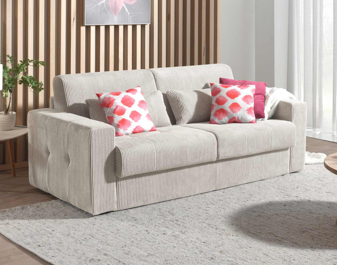 Le sommier du canapé 3 places convertible Sacha est composé d’un mécanisme métallique à ouverture express qui permet de déplier et replier le lit très facilement sans enlever les coussins d’assise et de dossier. Véritable canapé lit, Sacha est un canapé droit design et confortable en velours côtelé reposant sur une mousse polyuréthane de 25kg/m3 et avec un soutien du dos optimal. La nuit, il peut accueillir 2 personnes grâce à ses dimensions de 196x143 et vous garantir un sommeil apaisant comme un véritable lit.