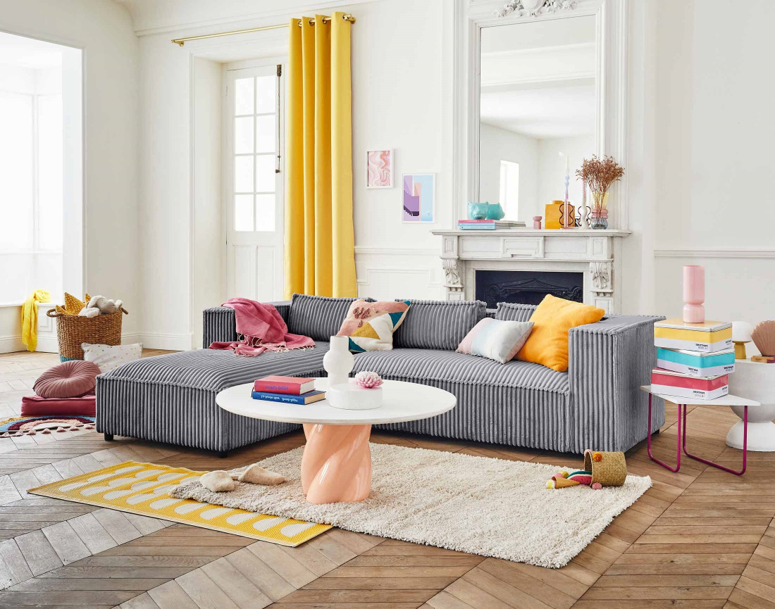 Disponible en plusieurs coloris ainsi qu’en velours côtelé plus fin, le canapé d’angle Stella est votre futur allié déco & détente pour passer des moments cocooning.