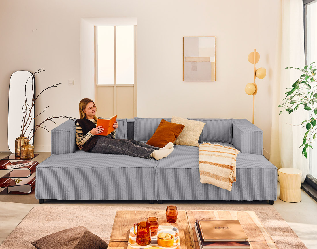 Le Stella ne serait pas le même sans son revêtement en velours côtelé. Subtil mélange de douceur et de caractère, il offre une texture qui capte la lumière et attire les regards. Au toucher, c’est un véritable coup de cœur : chaque fibre semble chuchoter luxe et réconfort. Mais ce n’est pas juste une question de style : son assise profonde et ses matériaux de qualité assurent un confort durable, jour après jour. Que ce soit pour lire un livre ou se lover dans un plaid devant la nouvelle série du moment, vous y passerez des moments toujours agréables.