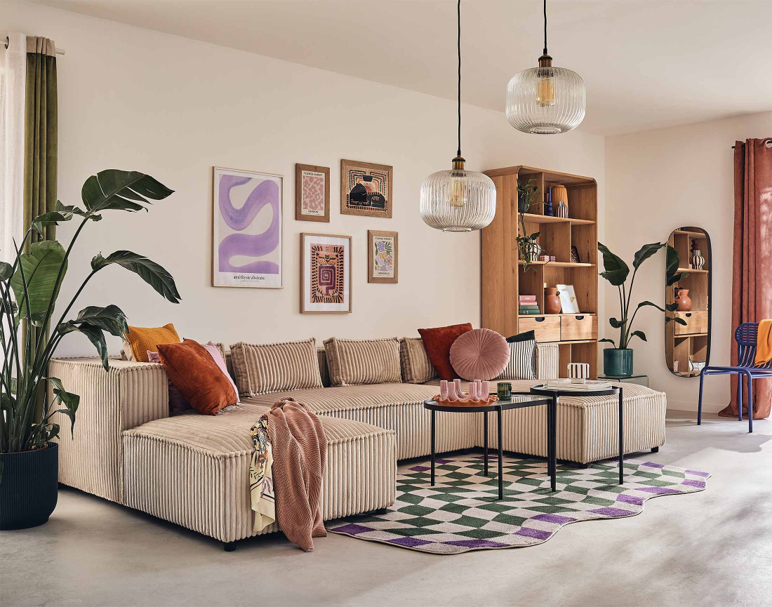 Disponible en plusieurs coloris ainsi qu’en velours côtelé plus fin, le canapé panoramique Stella est votre futur allié déco & détente pour passer des moments cocooning.