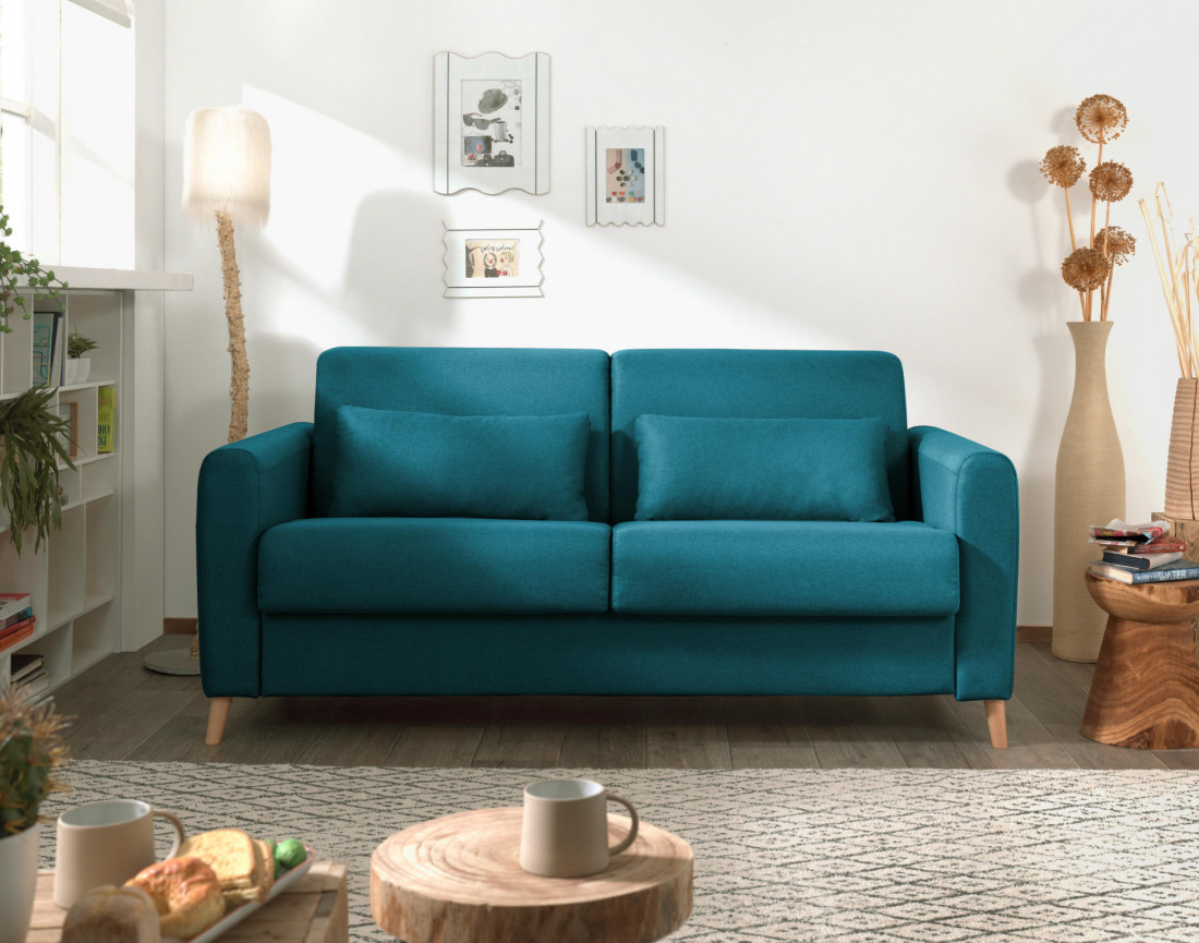 Le sommier du canapé 3 places convertible Timo est équipé d’un mécanisme métallique à ouverture express qui vous permet de déplier et replier le lit très facilement sans retirer les coussins de l’assise et du dossier. Avec ses dimensions de 143x196 cm, le lit accueille un matelas aux dimensions standards de literie de 140 par 190. Vous y passerez de bonnes nuits réparatrices ! Et la journée, Timo n’est pas en reste puisqu’il est confortable grâce à son assise en mousse polyuréthane et ses coussins de dossiers accueillants.