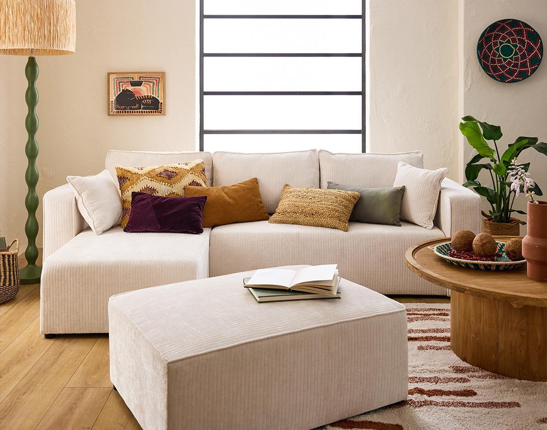 Le canapé Topaze vous fait profiter de ses atouts charmes indéniables : un velours côtelé plat hyper tendance, une assise généreuse et confortable, des accoudoirs volumineux et une douceur absolument inimitable. Il s’agit du canapé parfait pour profiter des avantages d’une méridienne tout en sublimant votre espace de vie. Son magnifique tissu s’accordera d’ailleurs parfaitement avec un intérieur aux notes douces et contemporaines : associez votre nouveau canapé avec un guéridon haut en bois clair ou à une lampe à pied d’inspiration bohème-chic, pour une décoration des plus soignées. Vous pouvez d’ailleurs choisir la couleur de votre nouveau canapé en fonction de vos goûts et du style décoratif désiré : beige, écru ou vert sauge pour un design minimaliste très en vogue, ou bleu, vert, latté ou gris pour une touche de modernité. À vous de décider !