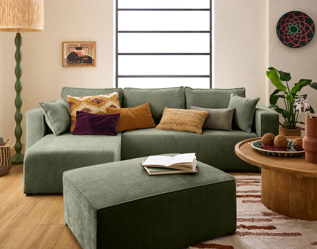 Le canapé Topaze vous fait profiter de ses atouts charmes indéniables : un velours côtelé plat hyper tendance, une assise généreuse et confortable, des accoudoirs volumineux et une douceur absolument inimitable. Il s’agit du canapé parfait pour profiter des avantages d’une méridienne tout en sublimant votre espace de vie. Son magnifique tissu s’accordera d’ailleurs parfaitement avec un intérieur aux notes douces et contemporaines : associez votre nouveau canapé avec un guéridon haut en bois clair ou à une lampe à pied d’inspiration bohème-chic, pour une décoration des plus soignées. Vous pouvez d’ailleurs choisir la couleur de votre nouveau canapé en fonction de vos goûts et du style décoratif désiré : beige, écru ou vert sauge pour un design minimaliste très en vogue, ou bleu, vert, latté ou gris pour une touche de modernité. À vous de décider !