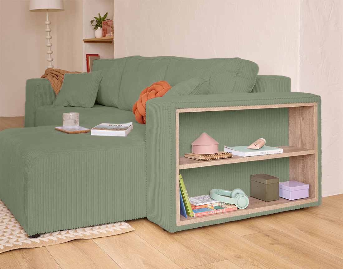 Le canapé Topaze se distingue par ses rangements : des poufs astucieusement dissimulés dans l'accoudoir gauche, parfaits pour optimiser l'espace, et des tablettes dans l'accoudoir droit, pour garder à portée de main tout ce dont vous avez besoin. Il possède également un coffre spacieux sous son assise, parfait pour ranger vos affaires discrètement tout en conservant un intérieur ordonné. Fabriqué en Europe avec un soin minutieux pour la qualité, le canapé Topaze allie savoir-faire et praticité.