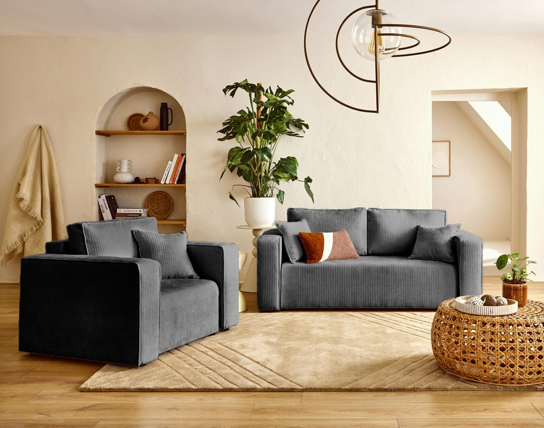 - Assise : Mouse polyuréthane 28kg/m3 – Dossier : Flocons de mousse – Ressorts ondulés – Structure en bois et panneaux de particules – Revêtement en velours côtelé plat 100% polyester – Pieds en plastique noir