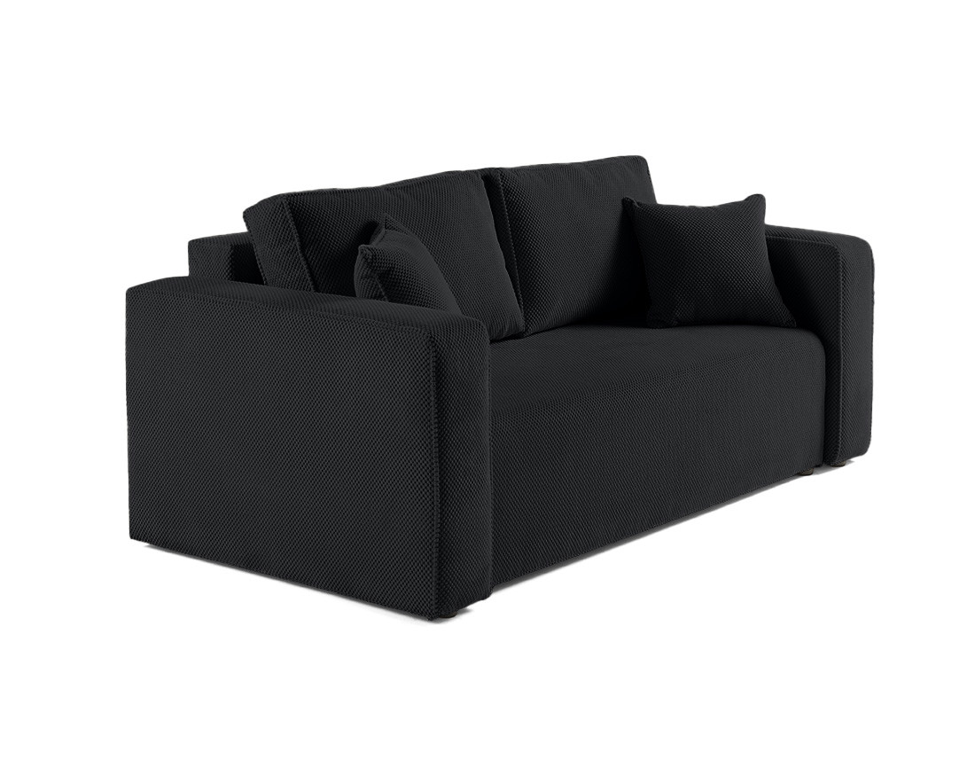 - Assise : Mouse polyuréthane 28kg/m3 – Dossier : Flocons de mousse – Ressorts ondulés – Structure en bois et panneaux de particules – Revêtement en velours texturé 100% polyester – Pieds en plastique noir