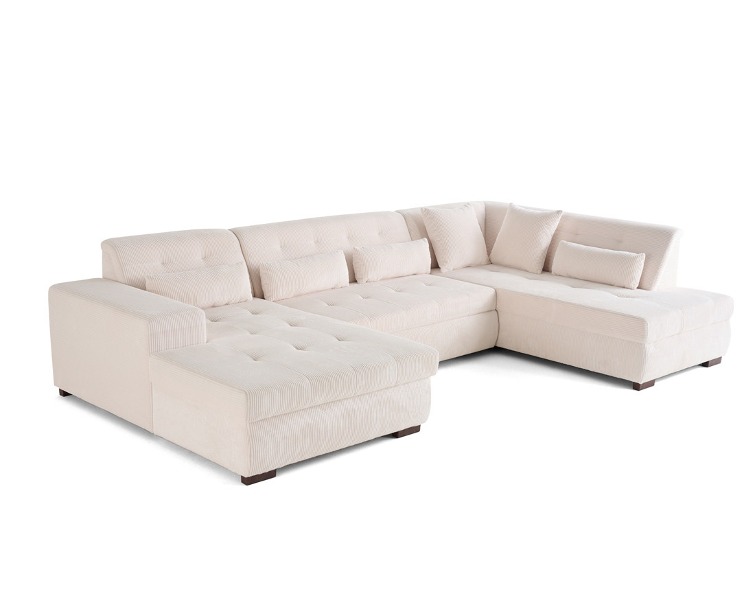 Confortable, moelleux, spacieux et très tendance, ce canapé 7 places panoramique est idéal pour les grands espaces et permet d’intégrer une pièce maîtresse dans votre lieu de vie. Découvrez sa texture ultra douce en velours côtelé : une matière pile dans l’air du temps, invitante à souhait. Le modèle Vermont 7 places panoramique ne manque ni de charme ni de fonctionnalités. Il s’agit d’un canapé comportant deux méridiennes de dimensions différentes, idéales pour créer du contraste et apporter une touche design à votre intérieur. Profitez d’une assise agréable, de dimensions généreuses, ainsi que d’un coffre de rangement très pratique : dissimulez-y à votre guise vos plaids ou vos jeux de société, par exemple. Vous pouvez également profiter de la fonction convertible de ce modèle en tirant simplement sur le tiroir situé sous l’assise principale. Une fonction très utile pour transformer votre grand canapé en lit d’appoint ou pour vous offrir une touche de confort supplémentaire.