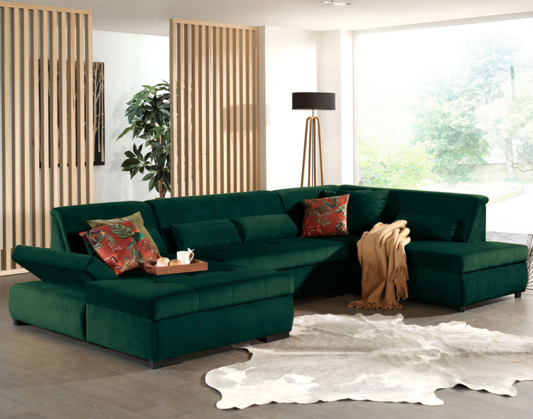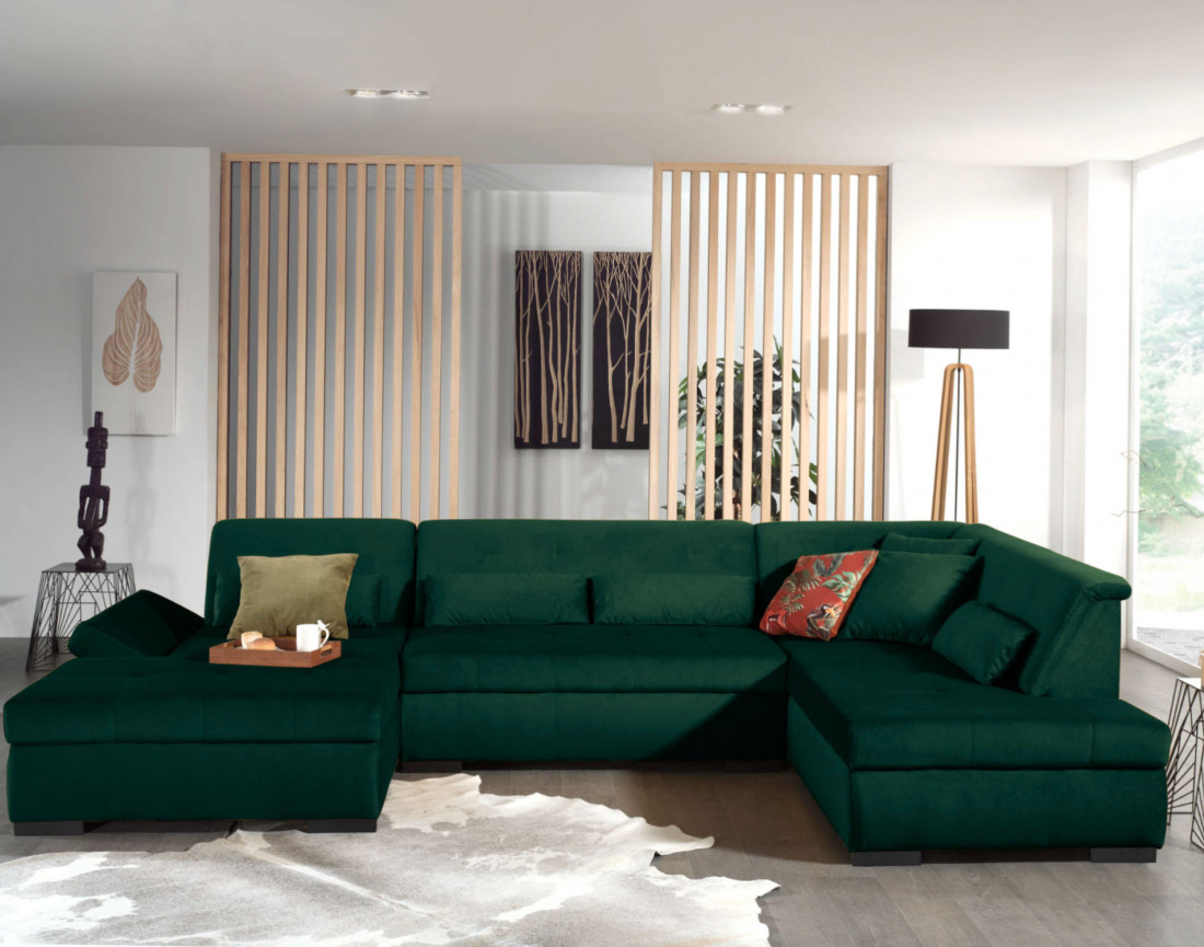 Le canapé d’angle panoramique en U Vermont vous séduira grâce à ses deux méridiennes et ses 3.35 mètres de largeur. Contemporain et moderne, il sera la pièce maîtresse de votre salon et pourra accueillir l’ensemble de vos proches grâce à son espace d’assise. Son revêtement en velours accentue l’élégance et le look moderne du canapé d’angle Vermont. Son assise, son accoudoir réglable en 3 positions et son dossier capitonnés agrémentés par des cales-reins et des coussins améliorent votre confort afin que vous puissiez vous détendre totalement.
