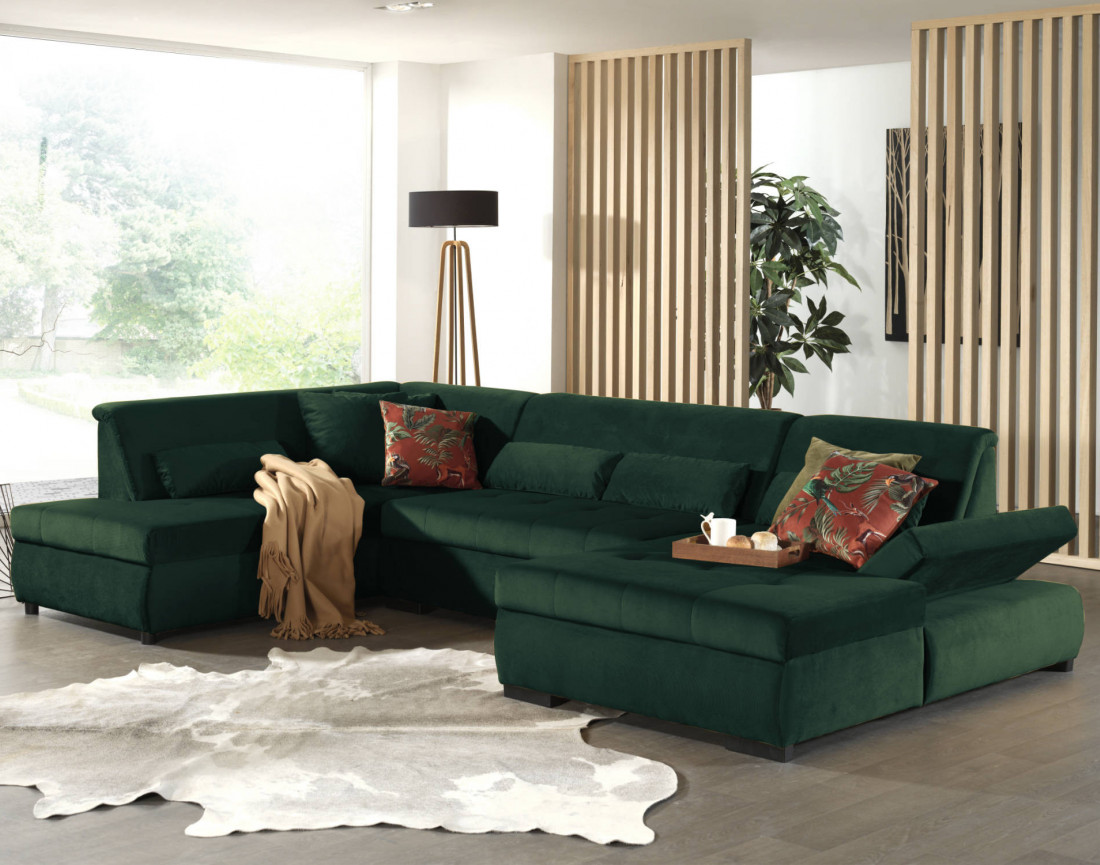 Le canapé d’angle panoramique en U Vermont vous séduira grâce à ses deux méridiennes et ses 3.35 mètres de largeur. Contemporain et moderne, il sera la pièce maîtresse de votre salon et pourra accueillir l’ensemble de vos proches grâce à son espace d’assise. Son revêtement en velours accentue l’élégance et le look moderne du canapé d’angle Vermont. Son assise, son accoudoir réglable en 3 positions et son dossier capitonnés agrémentés par des cales-reins et des coussins améliorent votre confort afin que vous puissiez vous détendre totalement.